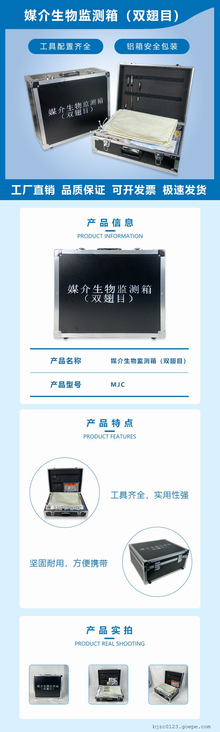 以下为本公司出售的双翅目类媒介生物检测箱,详情如下:媒介生物(双翅目)监测箱 序号 品名 数 量 功能 备 注 1 昆虫采集网 1把 用于捕捉昆虫 2 电动吸蚊器 1只 用于捕捉停落表面的成蚊 3 蚊幼虫采集网 1把 用于采集幼虫 4 蚊幼虫采集勺 1只 用于采集幼虫 5 放大镜 1只 现场用 6 毒瓶 1个 现场用 7 塑料器械盒 2只 装小型器械及标本管用 器械盒 8 PH试纸 1本 测蚊滴酸碱度 9 昆虫解剖针 1支 现场用 10 昆虫解剖刀3号 1支 安手术刀片 11 昆虫解剖刀4号 1支 安手术刀片 12 昆虫解剖11号刀片 10/1包 与刀柄连用 13 昆虫解剖23号刀片 10/1包 与刀柄连用 14 昆虫针00~5#(100支/包x7) 7包 用于蚊、蠓的标本制作 15 昆虫微针(每包100支) 1包 用于蚊、蠓的标本制作 16 昆虫弯镊(20cm) 1把 现场采集标本处理 17 昆虫直镊(20cm) 1把 现场采集标本处理 18 昆虫尖镊(16cm) 1把 现场采集标本处理 19 昆虫弯尖镊(16cm) 1把 现场采集标本处理 20 手术剪(弯) 1把 现场采集标本处理 21 手术剪(尖) 1把 现场采集标本处理 22 不干胶带 1卷 现场采集标本处理 23 塑料吸管 5支 吸酒精滴于标本管 24 创可贴 10个 多用途 防护用品 25 脱脂棉签 3袋 消毒 26 一次性口罩 1包 防护 27 卷尺 1把 3米 28 昆虫针插三级板 1件 用于标本制作 29 整姿台 1个 用于标本制作 30 标本盒 2个 用于标本制作 30 小标本管 10支 装蠓标本,塑料盒装 31 标本管 10支 盛蚊幼虫,塑料盒装 32 大标本管 10支 收集蜚蠊蝇标本,塑料盒装 33 酒精瓶 1只 盛装75%酒精 34 酒精喷雾瓶 1只 盛装75%酒精 35 诱蟑螂盒 2只 置于蟑螂活动场所,调查蟑螂指数 36 蟑螂粘纸 10张 置于蟑螂活动场所,调查蟑螂指数 37 标本冷藏瓶 1个 病原监测标本暂存 38 球形吸虫管 1 个 标本位移 39 媒介生物监测手册 1个 蚊虫抗性接触测试 40 LED充电式手电筒 1只 现场用 41 脱脂棉 2袋 多种用途 42 昆虫采集标签 10张 现场采集记录签 43 蚊蠓叮咬防护服 1套 野外防蚊、蠓叮咬 44 带封口塑料袋 10只 现场用 45 耐用乳胶手套 2付 野外蚊、蠓采集用于手的保护 46 乳胶手套 5付 野外蚊、蠓采集用于手的保护 47 棉手套 2付 野外蚊、蠓采集用于手的保护 48 多功能刀 1把 为备用辅助工具 49 计数器 1枚 计昆虫数 50 记录笔 1支 现场记录 51 记录本 1本 现场记录 52 铝镁合金箱 1只 盛装以上备品 备注 本产品为媒介生物监测箱1型,其配置仅供参考,详情请联系当前负责人 -
